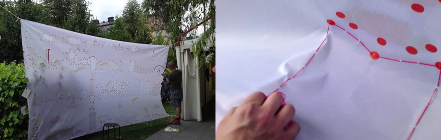 Vi hade även ett stort prick-till-prick-broderi med Stockholms skyline där festivalbesökarna med nål och broderigarn kunde rita om Stockholm efter eget huvud. Prick-till-prick, eller Connect the dots, var besökarnas chans att få tycka till om Stockholms arkitektur samtidigt som de fick skapa själva. Vi tillverkade tillsammans ett gigantiskt prick-till-prick med Stockholm som motiv. Vi spände upp en duk om cirka 2 gånger 6 meter på vilken Stockholms "skyline" var förberedd i prickar och det blev sedan upp till besökarna att dra streck med tejp, tuschpennor eller genom att brodera och göra färdigt motivet. Ungdomarna fick möjlighet att tycka till om stadens utseende och framtid genom att rita egna prickar, dra egna streck och skapa själv. Vad tycker Ung08-ungdomarna om Slussens framtid? Vill de ha skyskrapor på Kungsholmen? River de Stadsbiblioteket? Skiter de fullständigt i Hötorgsskraporna?